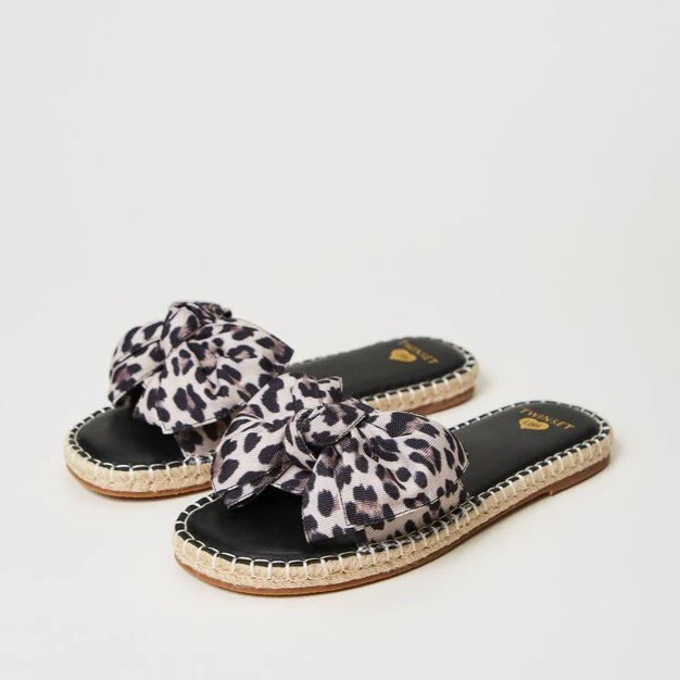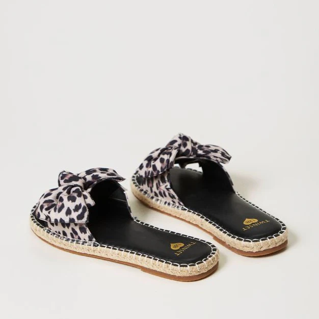 Sandali slide con fiocco stampato, fondo in corda e suola in gomma.