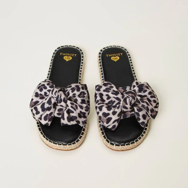 Abbina al tuo look questi sandali slide con maxi fiocco stampato in coordinato con i modelli di collezione, fondo in corda e suola in gomma. Cool e rasoterra per portarti con stile dove vuoi.