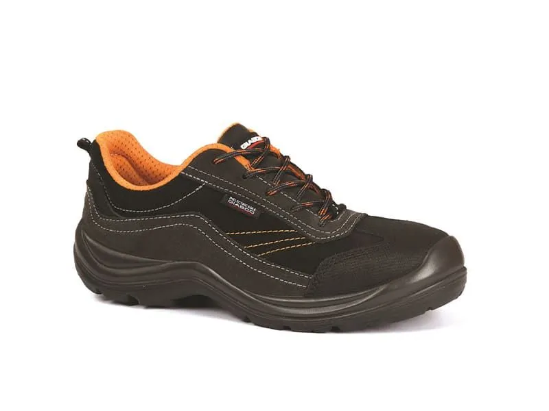 Scarpa antinfortunistica bassa, in pelle groppone scamosciato WRU, con punta in pelle antigraffio spessore 1,8-2,0 mm.