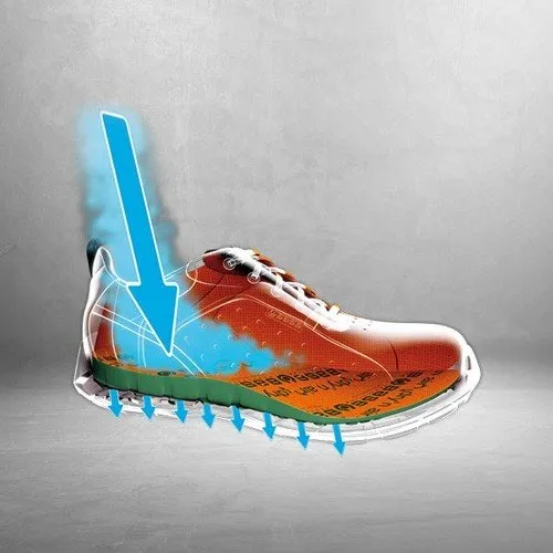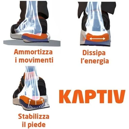 - Intersuola con tecnologia “i-daptive” che controlla la stabilità del piede durante i movimenti, ammortizzando l’energia d’impatto in realazione alla forza e al peso del lavoratore; in tal modo il sistema riporta in asse il piede e le articolazioni del corpo, adattandosi di volta in volta al tipo di superficie, migliorando la postura e il comfort