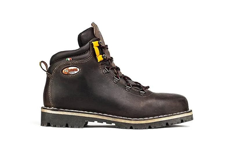 Scarpa in pelle bovina; Fodera in pelle pieno fiore; Lamina antiperforazione e puntalino antischiacciamento; Sistema di sfilamento rapido; Suola HIKER in gomma antiscivolo antiusura. UNI EN ISO 20345:2012 S3 HRO Colori Marrone Taglie 37-48