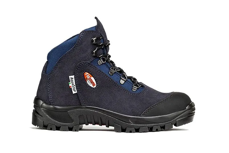 Scarpa in pelle scamosciata con inserti in cordura; Fodera AQUASTOP impermeabile e traspirante; Lamina antiperforazione e puntalino antischiacciamento; Suola SPIDER in gomma antiscivolo. UNI EN ISO 20345:2012 S3 WR CI HRO SRA Colori Blu Taglie 38-49
