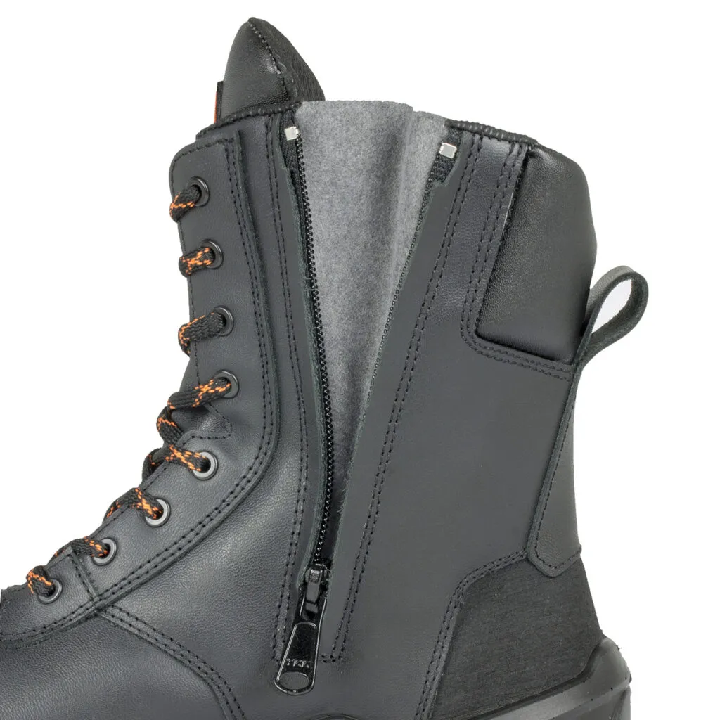 Safety boot made of full-grain Idrotech leather with high water resistance proprieties. The Exotech lining is a woven/non-woven fabric made of nylon fibers. The outcome is a shoe with excellent sweat control and high abrasion resistance, which combined with heat-insulating synthetic material, offers excellent comfort and dry feet, protecting them from cold outside. Over-cap and counter made of X-Leather, reinforced material with multi-layer polyurethane, high abrasion resistant. The padded TPU in the ankle area guarantees impact protection. Two-component Icon Pu-Rubber Vibramยฎ sole, guarantees maximum support and stability on difficult uneven grounds. Slip-resistance sole tested to the SATRA laboratories on metal grating and wooden scaffold boards. PZX fiberglass toe cap and anti-puncture Txzero insert for extreme lightness, protection and flexibility