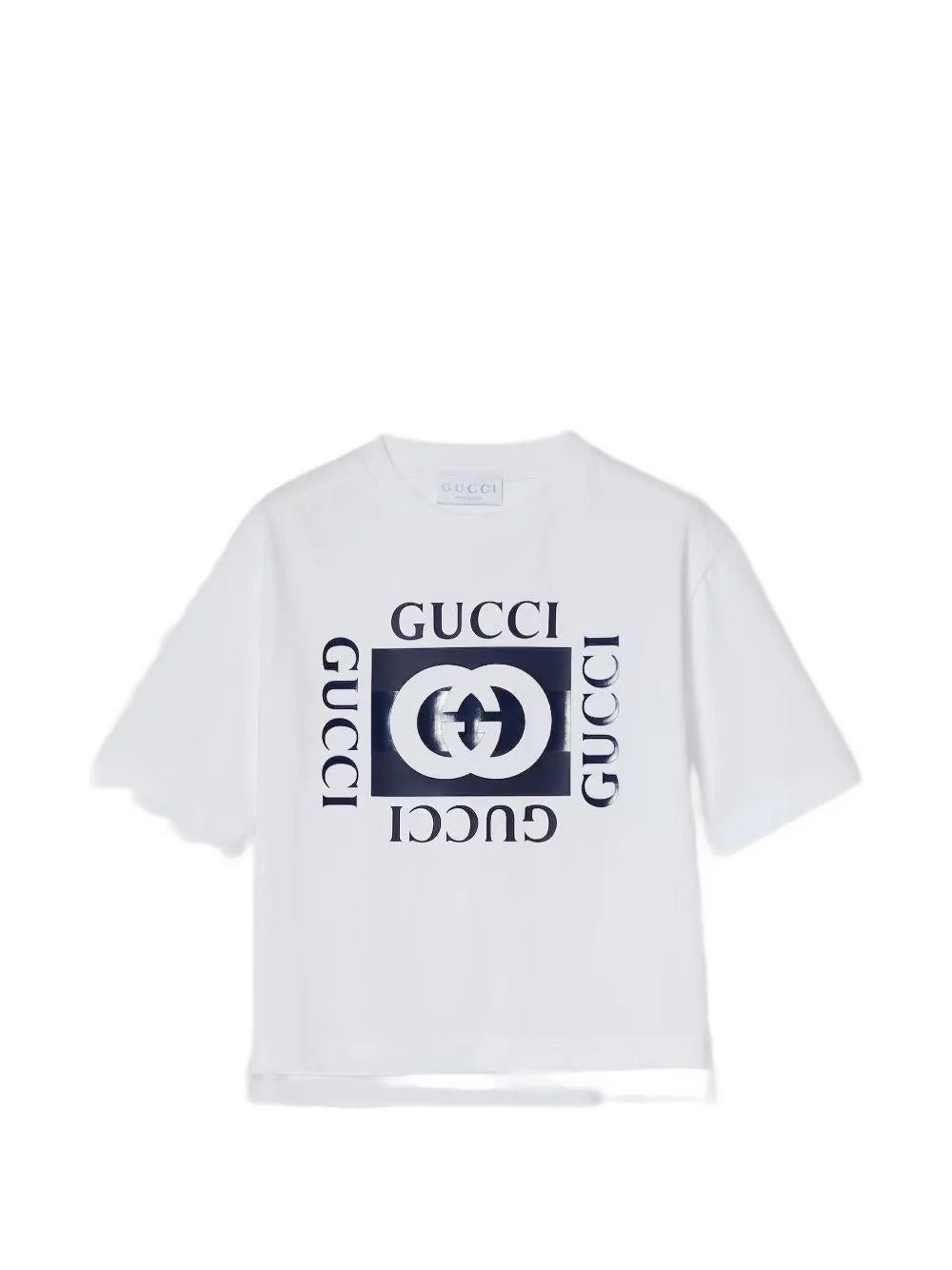 T-shirt con stampa Gucci Kids, bianco/blu, jersey di cotone, girocollo, maniche corte, stampa logo GG incrociato, taglio oversize.