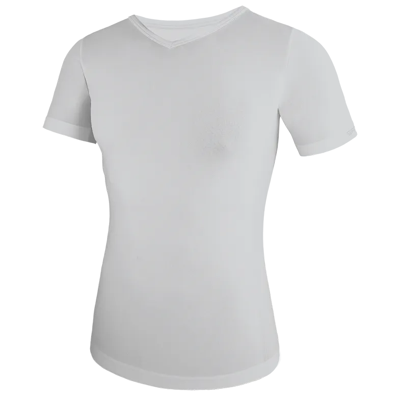 Maglia manica corta con collo a “V”. Impedisce la formazione di cattivi odori, è anallergica e traspirante con proprietà termoregolanti. Pelle sempre asciutta espellendo l’umidità e il sudore verso l’esterno. Favorisce la massima libertà di movimento.