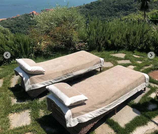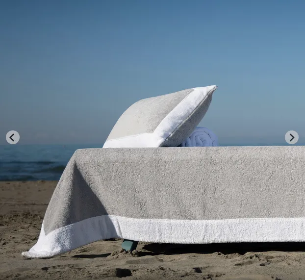 Il telo Forte dei Marmi, tipico delle spiagge in Versilia, è realizzato in spugna di cotone pettinato, di alto spessore e morbidezza, che non stinge al sole né al cloro.