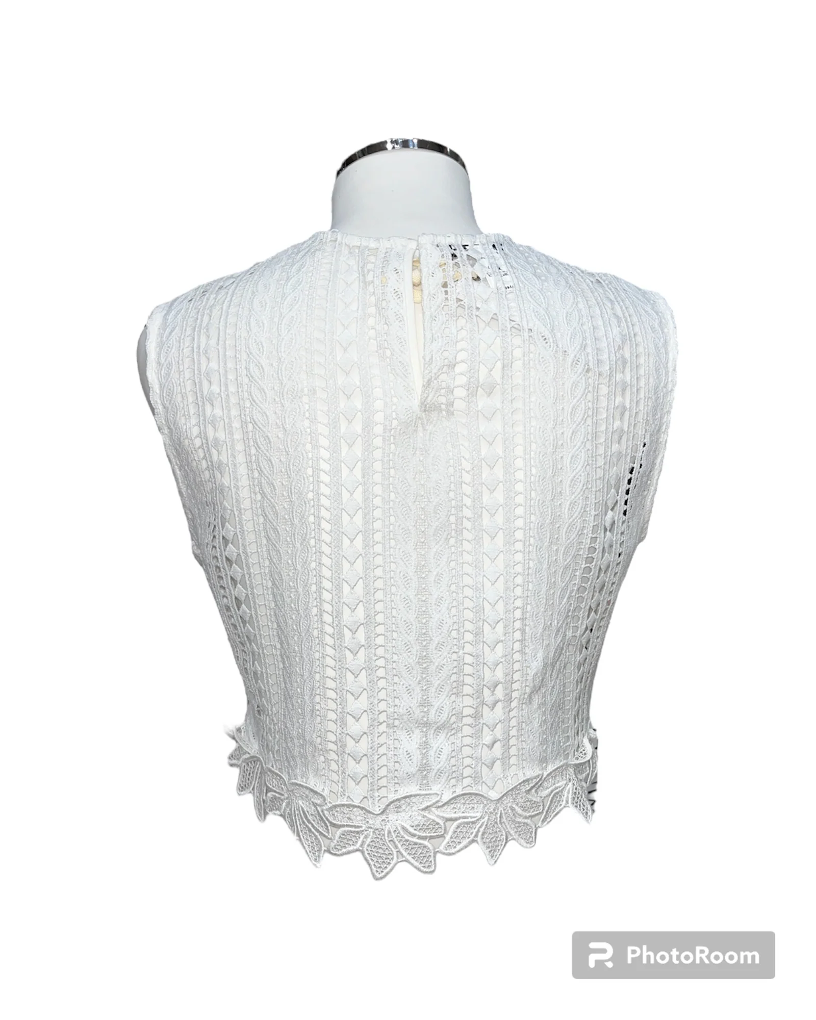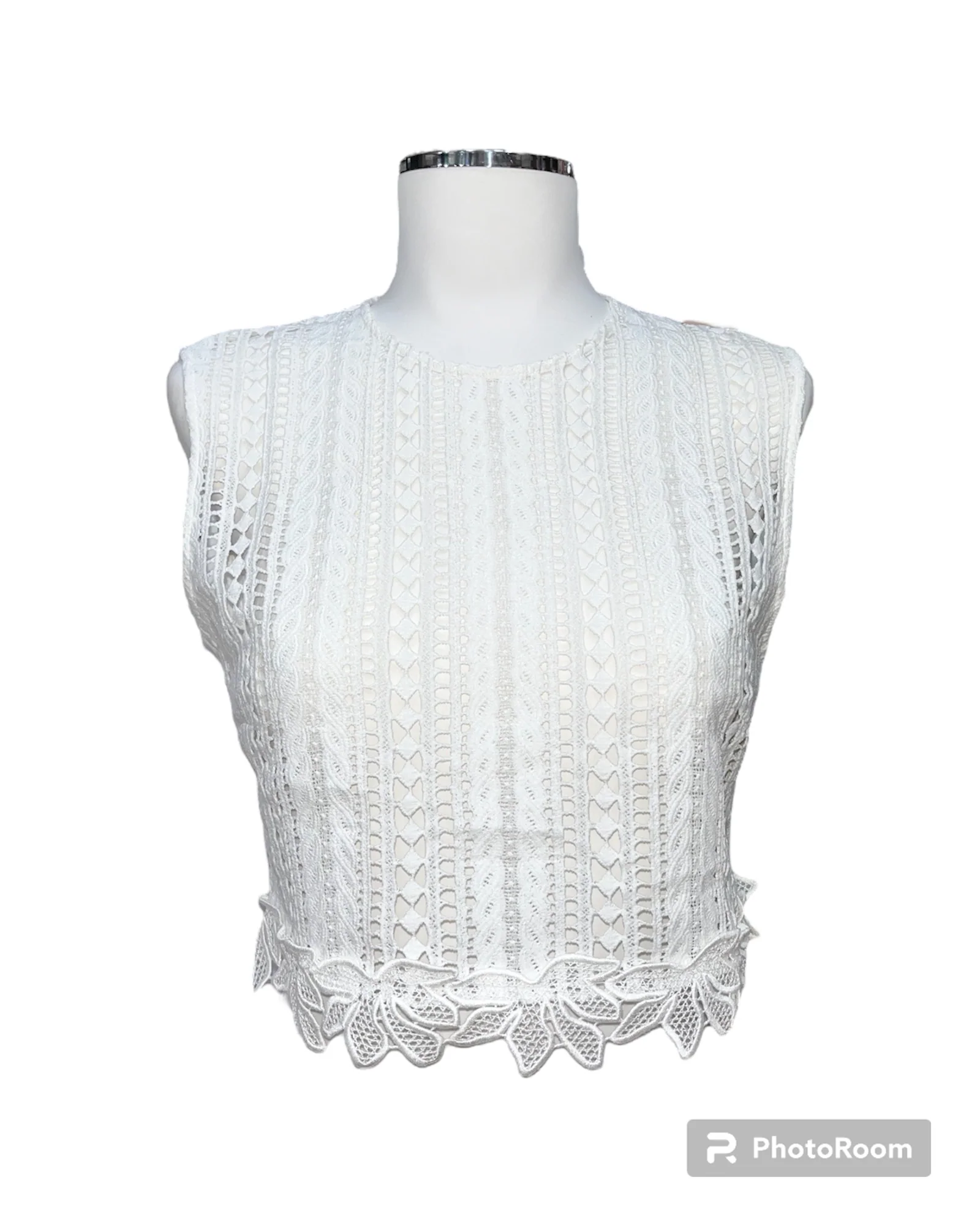Top corto smanicato in macramè geometrico con applicazione di fiori sul fondo. È coordinabile con la gonna dello stesso tessuto per avere un completo estivo glam.