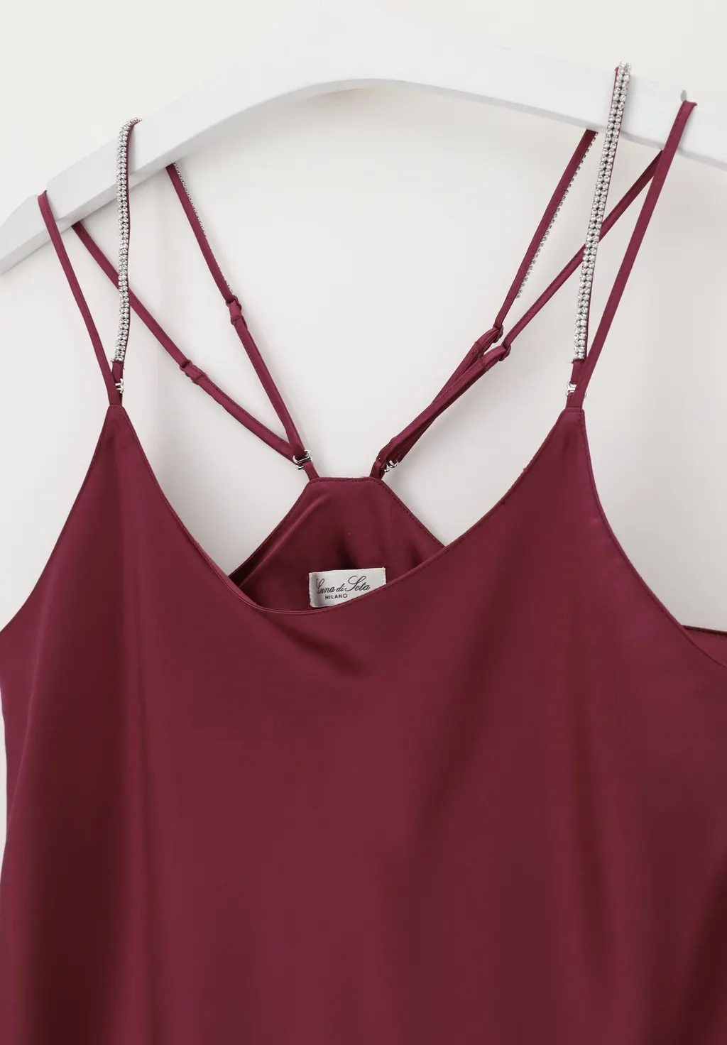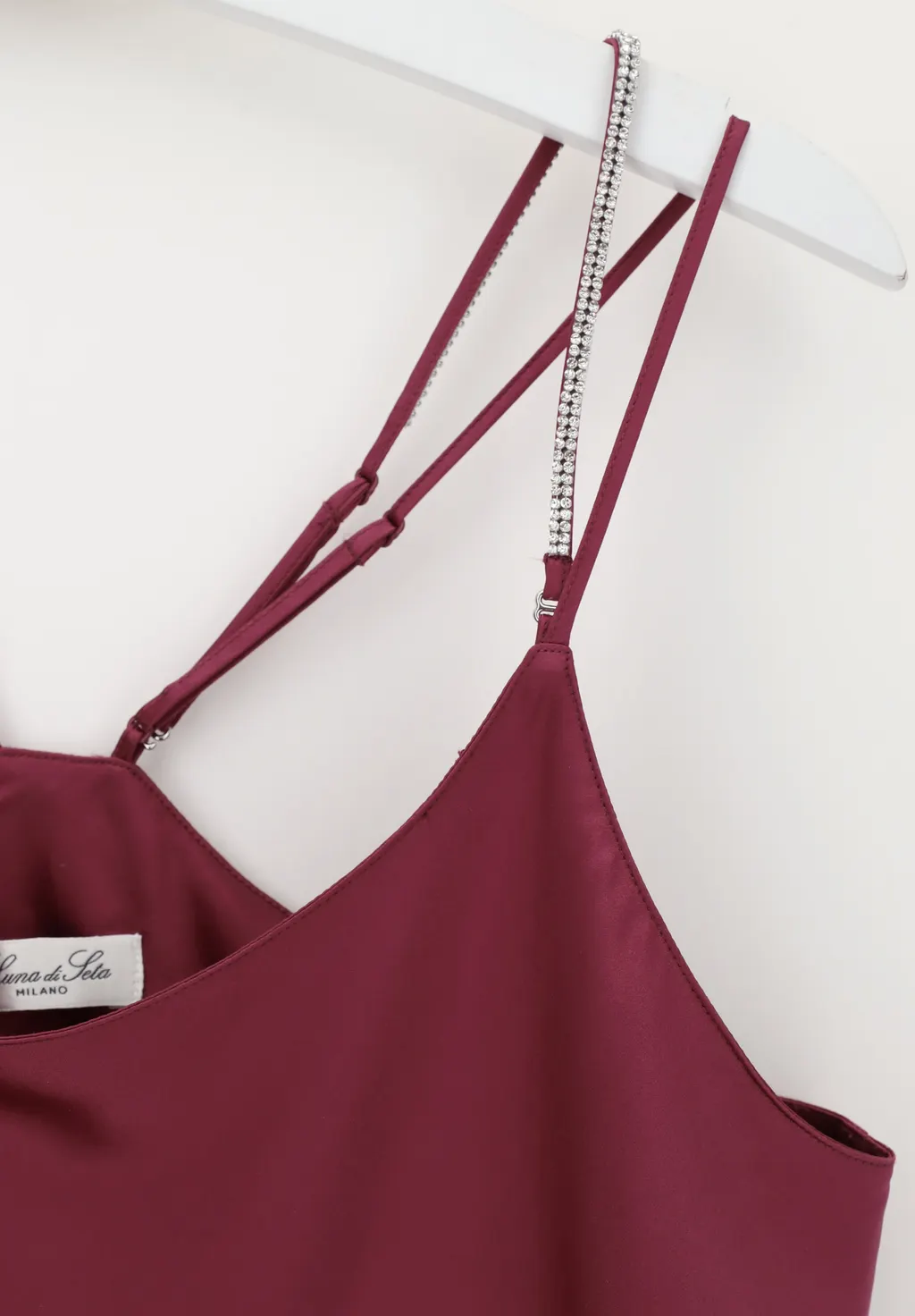 Top realizzato in morbido e lucente raso di seta impreziosito da lucenti strass sulle spalline removibili che rendono il capo ancora più brillante e luminoso. Molto versatile, perfetto da indossare sopra una culotte o come sottogiacca, molto femminile e romantico.