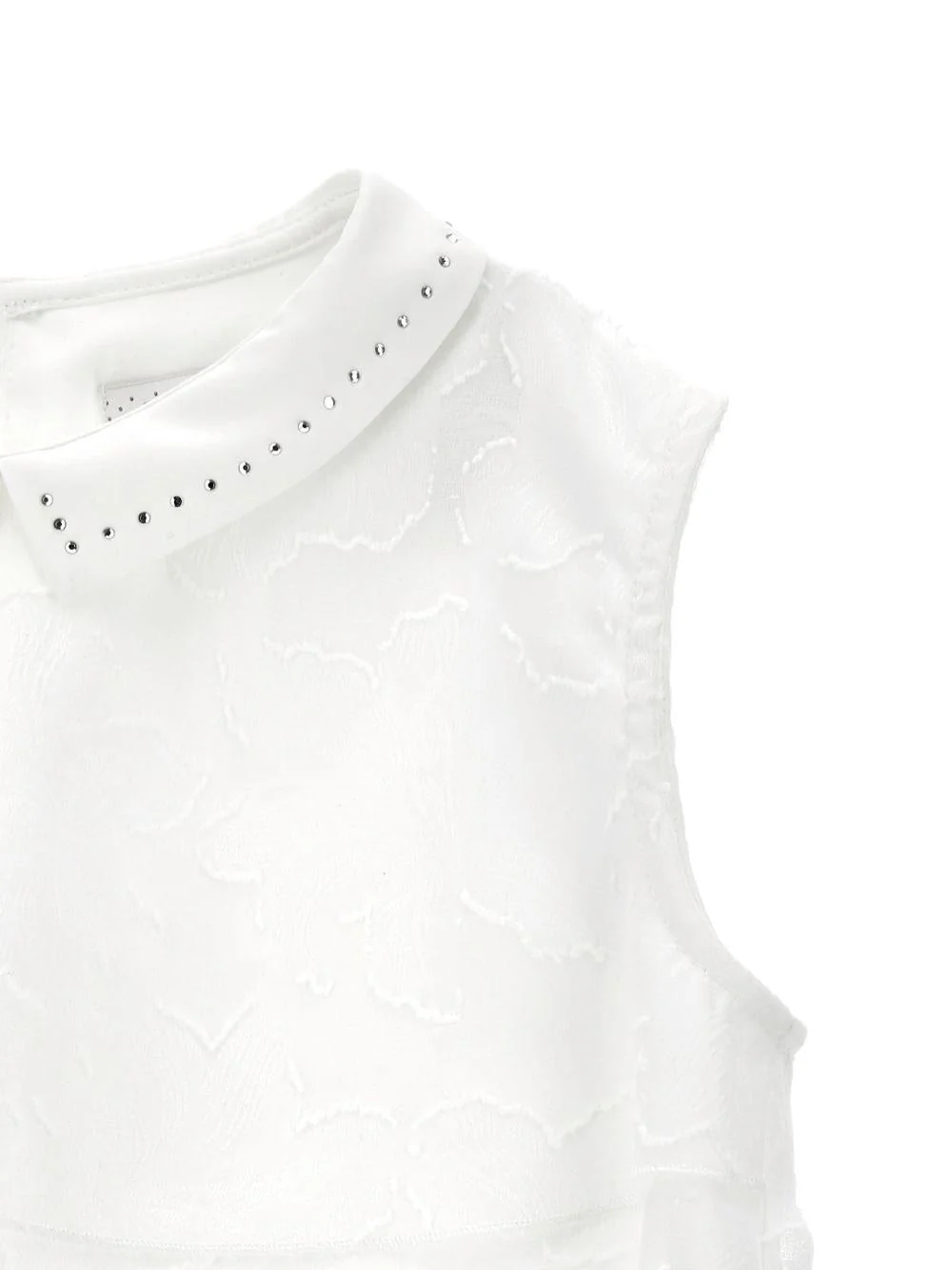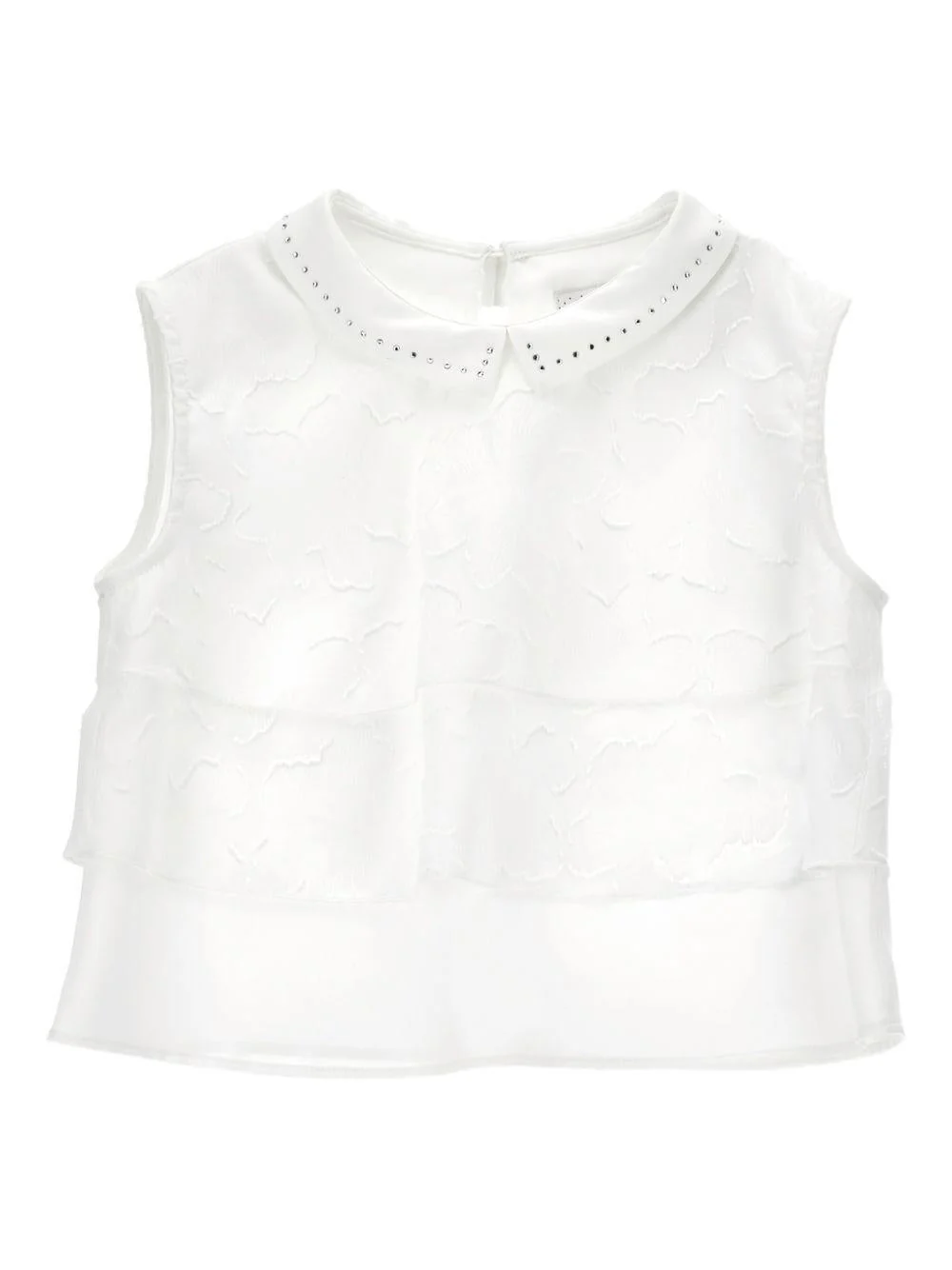 Top Monnalisa, bianco, elegante, senza maniche, colletto decorato con strass, balze increspate.