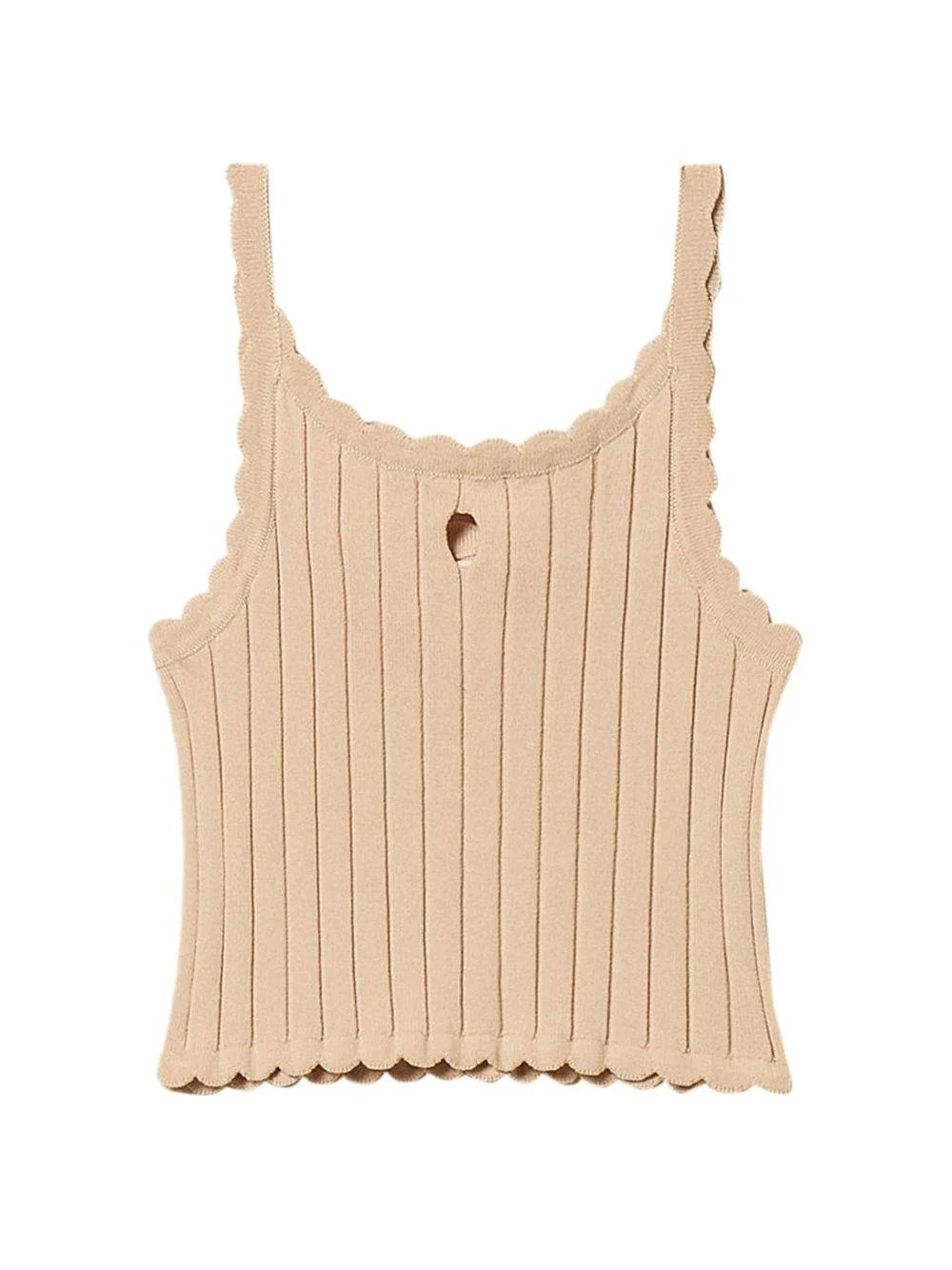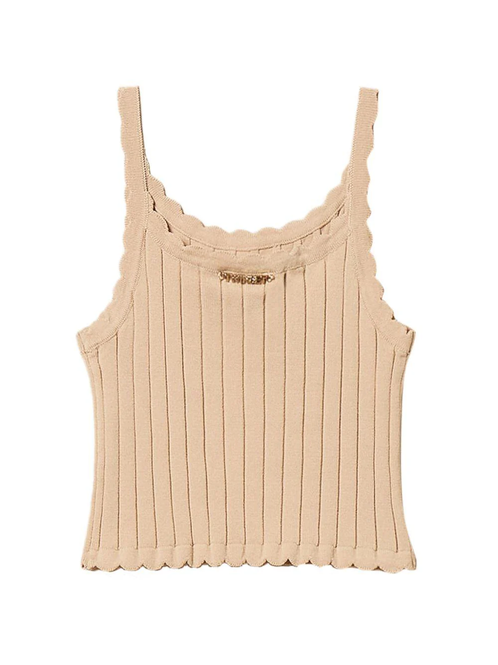 Top Twinset Kids, beige, modello crop, lavorato in maglia a coste, senza maniche, logo in metallo, orlo a smerlo.