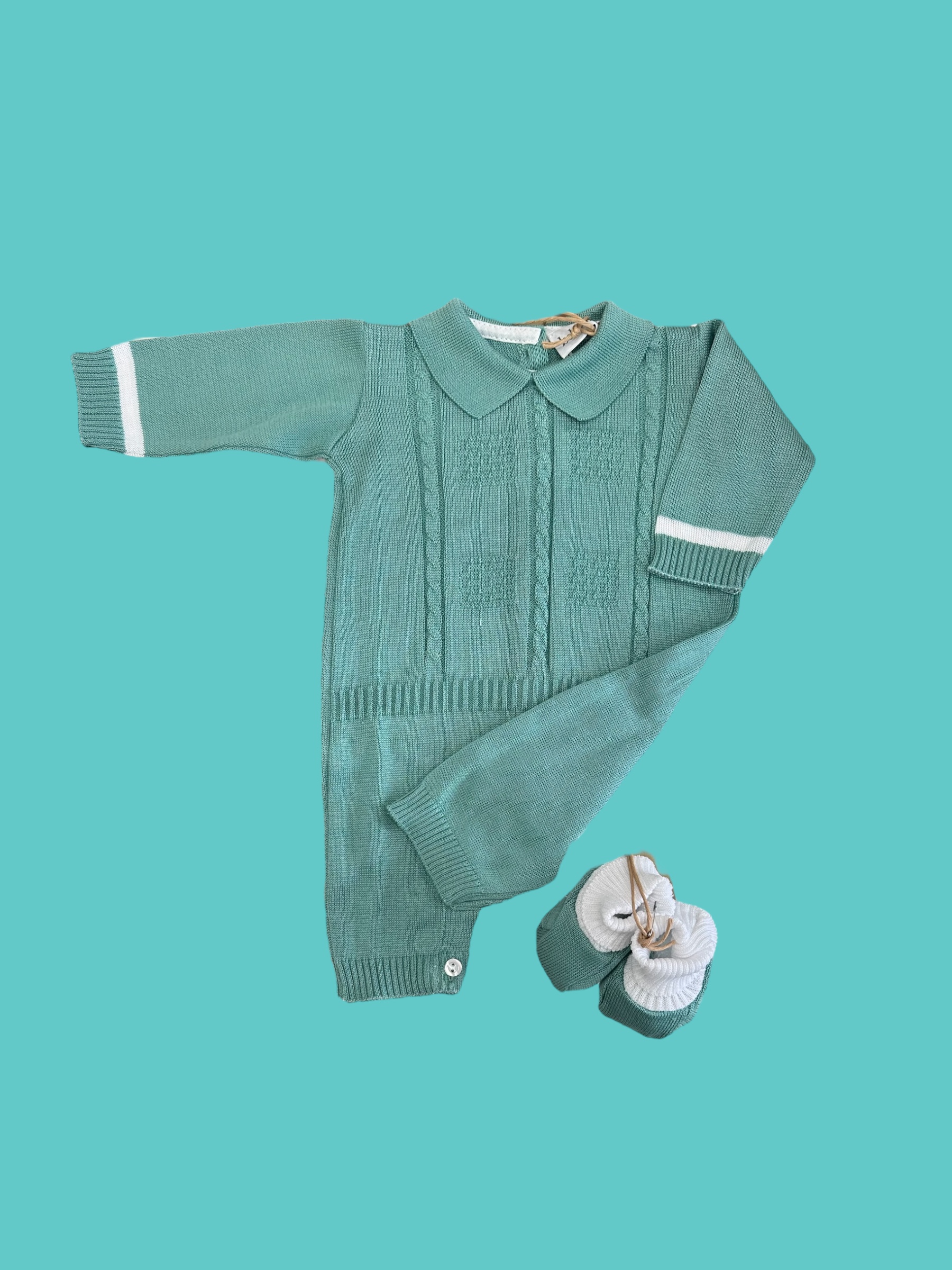 olcissima tutina in filo di cotone con scarpine coordinate realizzata in verde con dettagli bianchi.