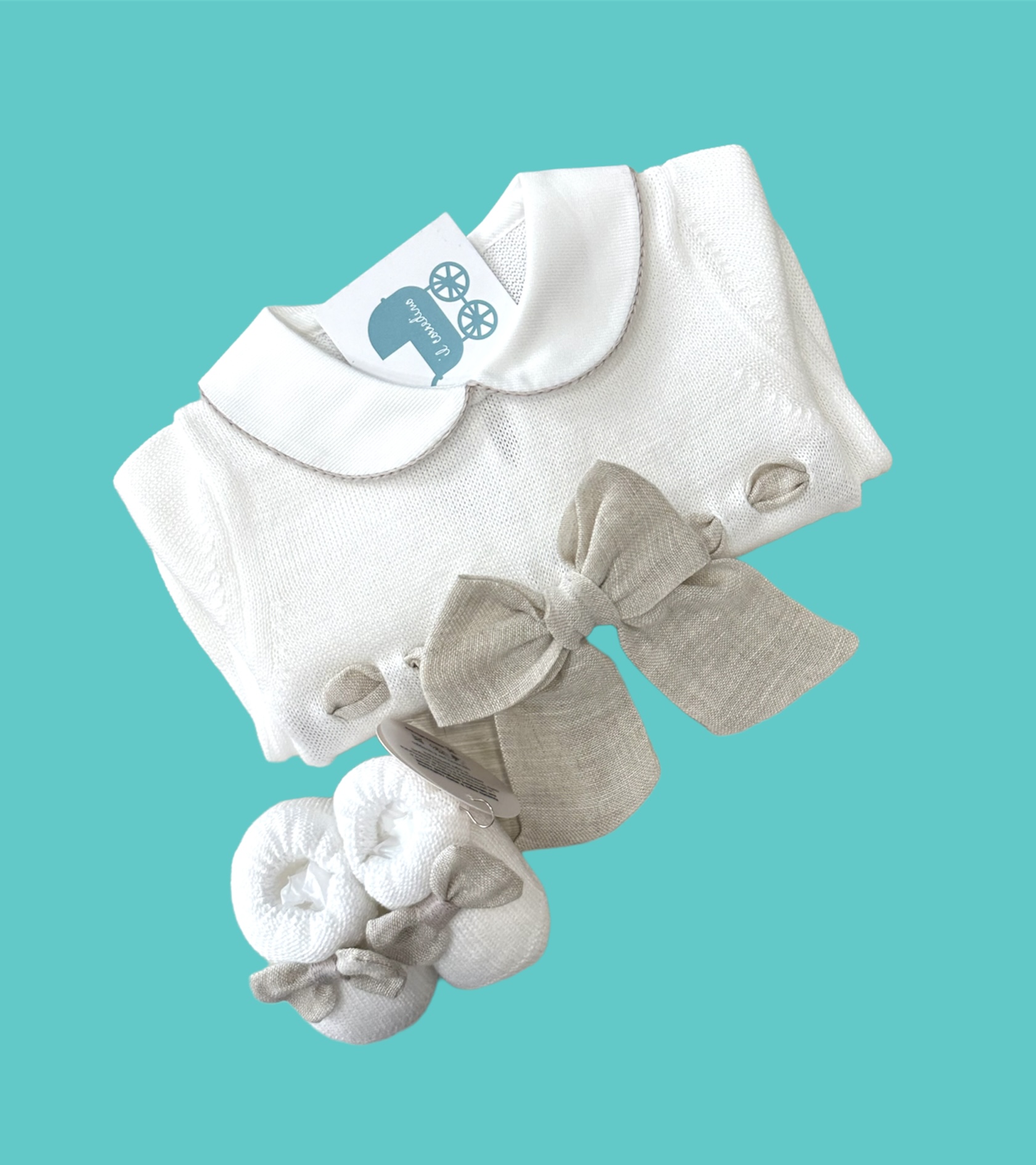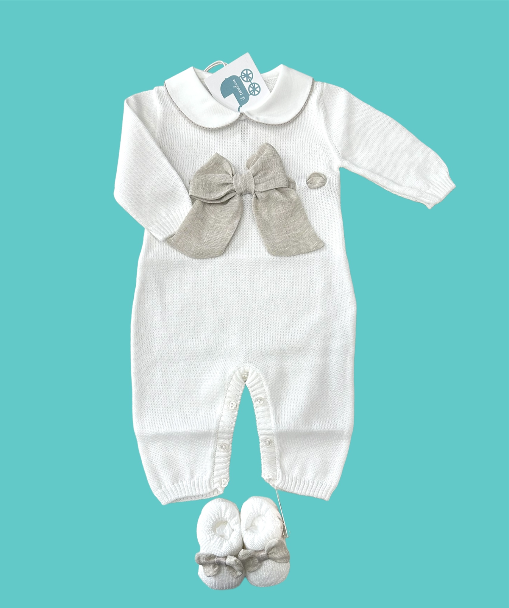 Raffinata tutina in 100% filo di cotone bianco con dettagli in lino sabbia con scarpe coordinate.