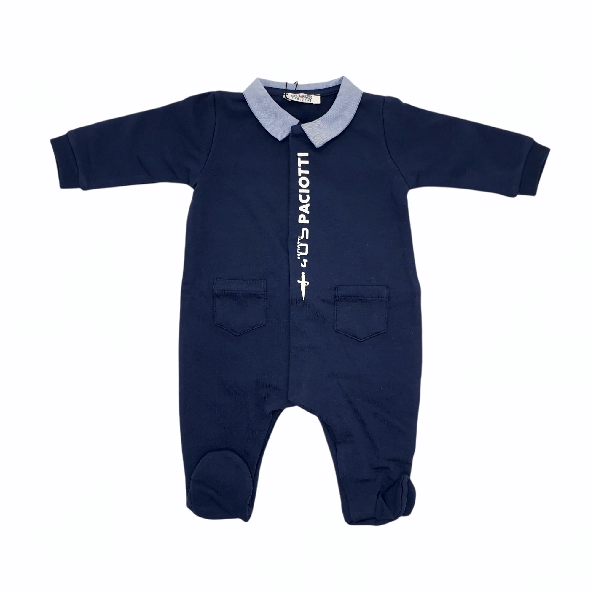 Tutina in felpa blu invernale con logo sul davanti scritto in verticale, taschini applicate e collo in cotone effetto jeans il retro è semplice 1 M = 56 CM 3 M = 62 CM