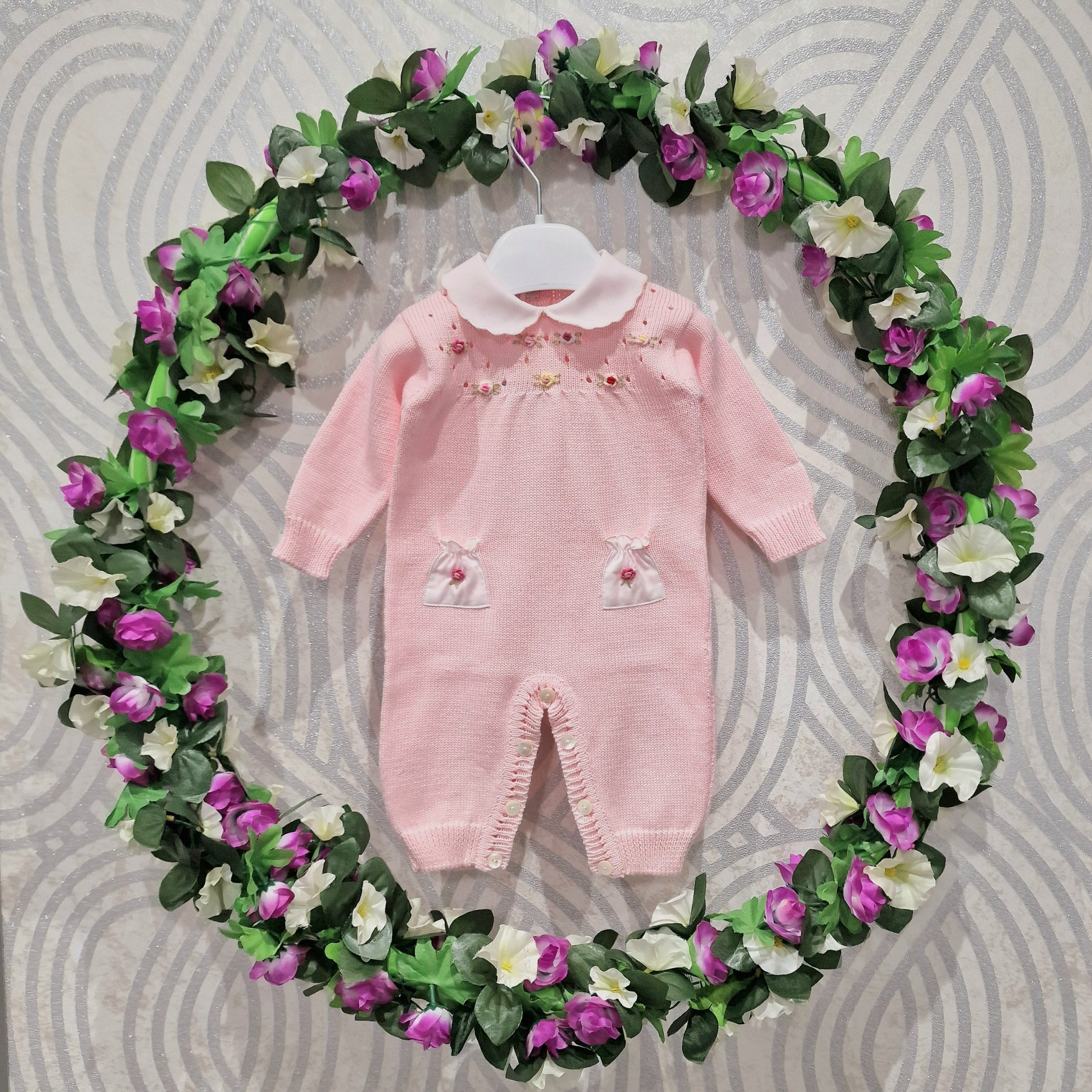 Tutina 100% cotone in filo, leggera traforutura con ricamo rose e taschini. Il prezzo è comprensivo di babbucce.