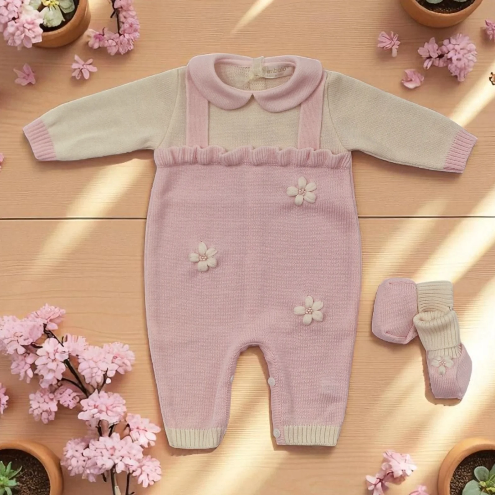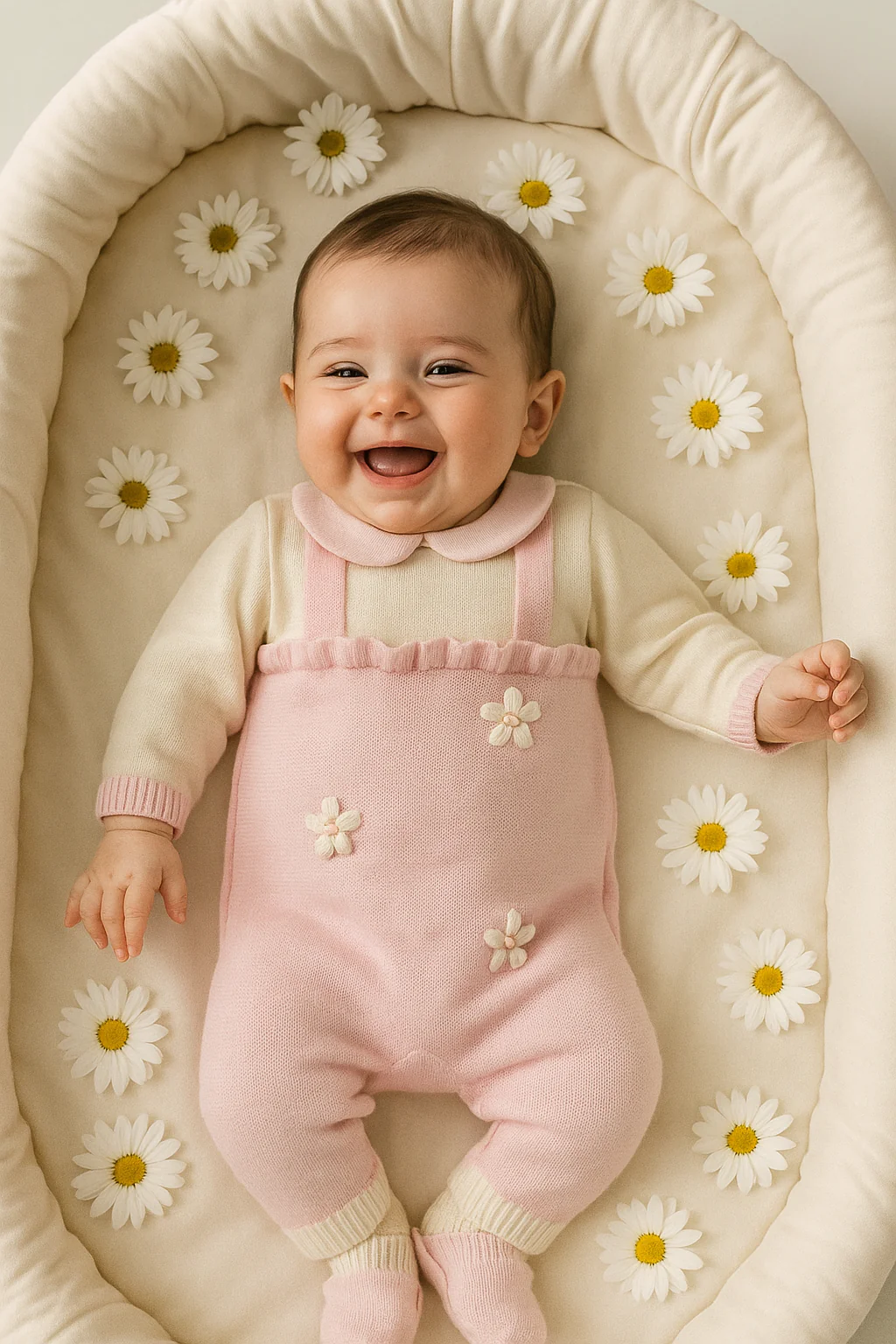 Questa tutina per neonata, realizzata al 100% in lana di alta qualità, offre calore e comfort ideali per i più piccoli. Le bretelle applicate garantiscono una vestibilità sicura e pratica, mentre il delicato ricamo di margherite aggiunge un tocco di eleganza artigianale. Perfetta per mantenere la tua bambina avvolta in morbidezza durante le giornate più fresche.
