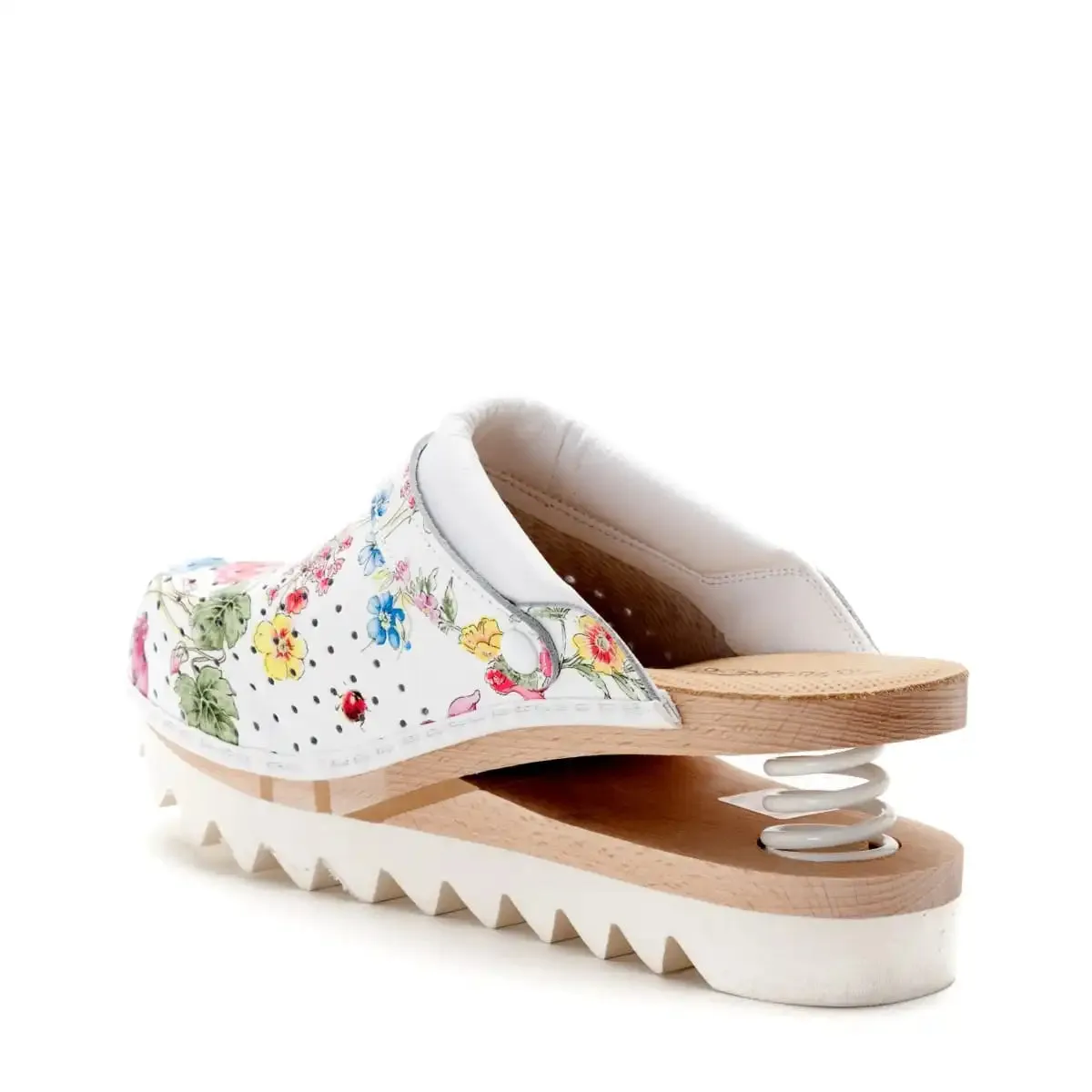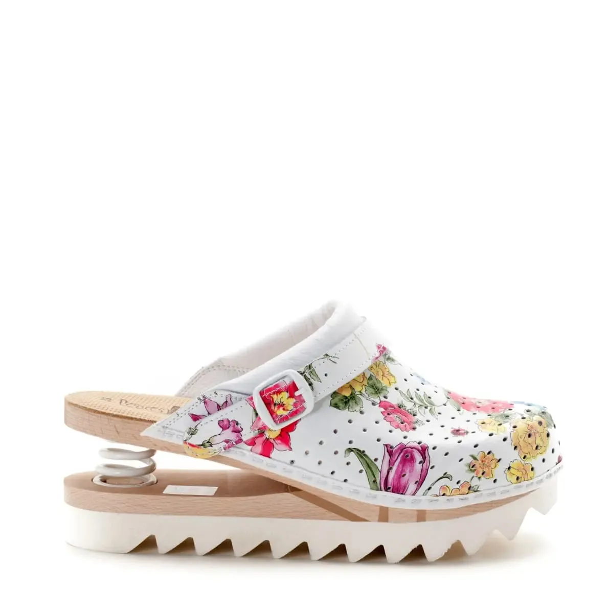 Grazie all’elasticità della sua molla, ammortizza l’urto del piede e trasforma ogni piccolo passo in un salutare esercizio per riattivare la circolazione. La molla ha il compito non indifferente di donare leggerezza allo zoccolo, di non appesantire il piede diminuendo la fatica; evita lo squilibrio del peso del corpo, assorbe i traumi del terreno che sono spesso causa di contusioni o slogature dei piedi che calzano zoccoli normali; favorisce il circolo vascolare plantare della gamba con la delicata spinta che trasmette al piede, evitando edemi, senso di stanchezza, dolori ai polpacci. Per sviluppare correttamente le indubbie qualità sanitarie del sistema…