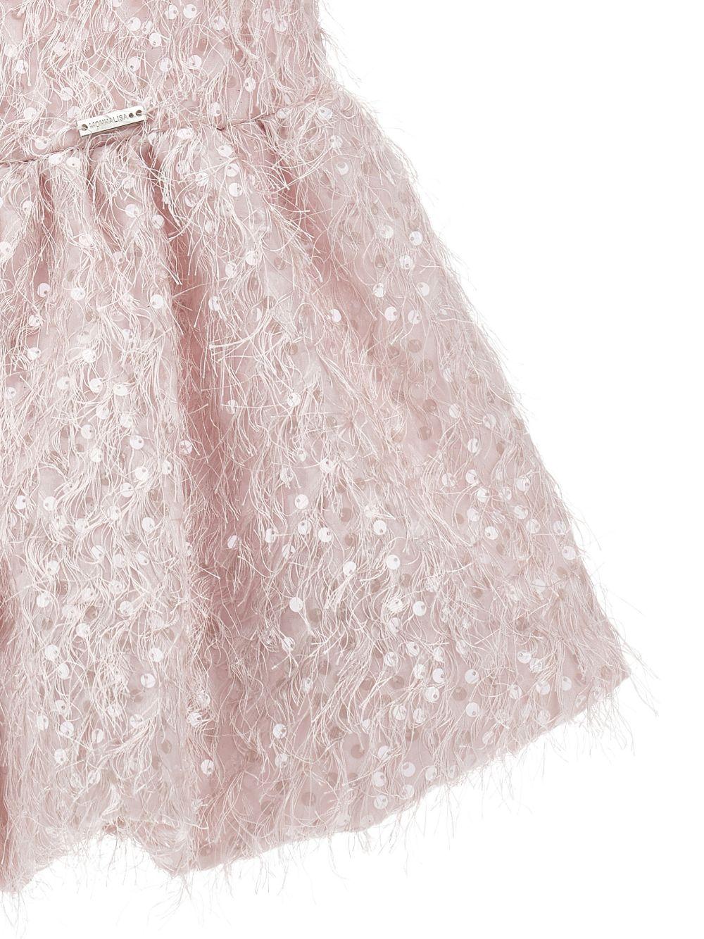 Abito pailettes Monnalisa, rosa, senza maniche, colletto classico, motivo paillettes e piume, gonna a ruota, chiusura con bottoni gioiello sul davanti.