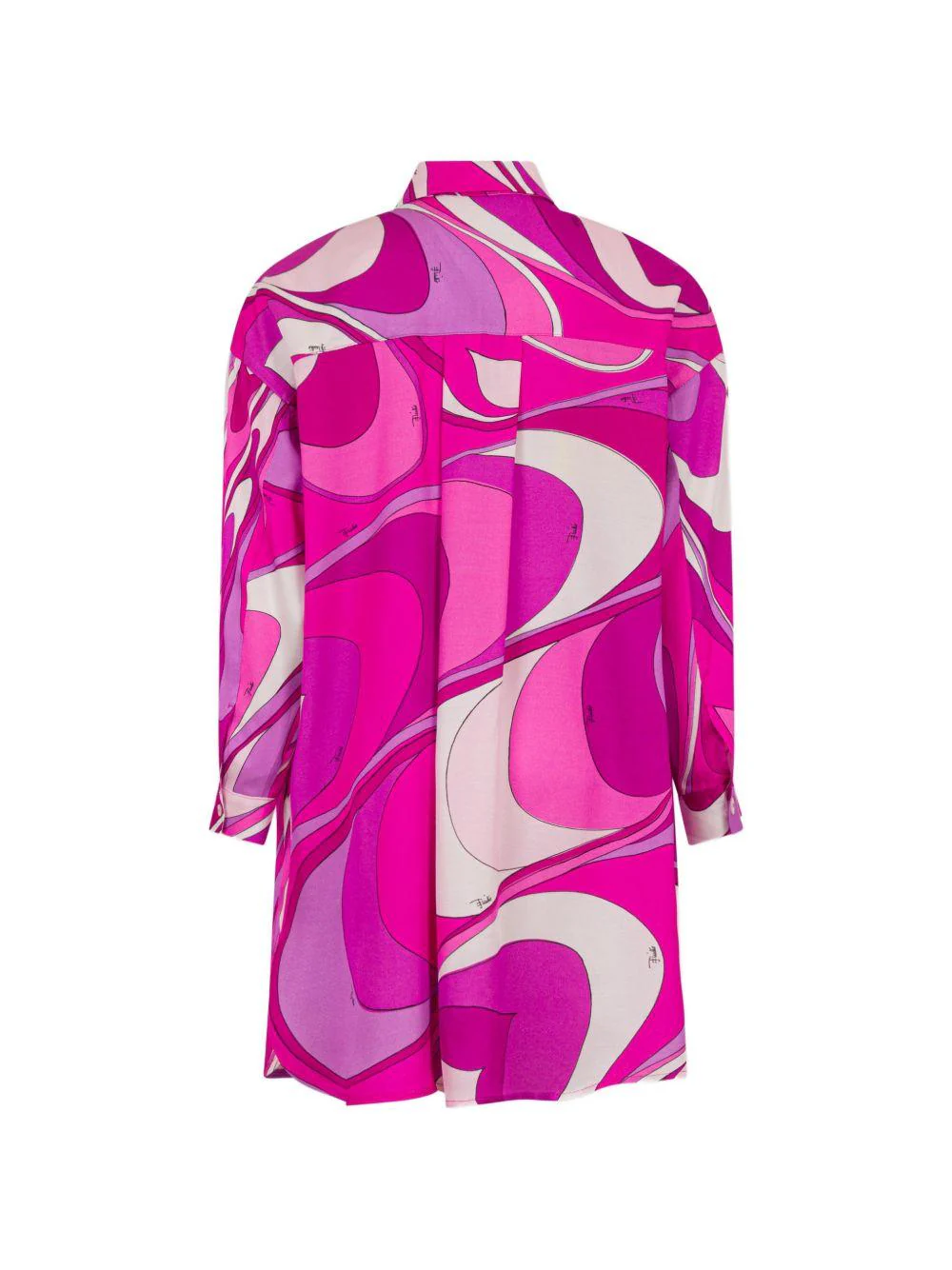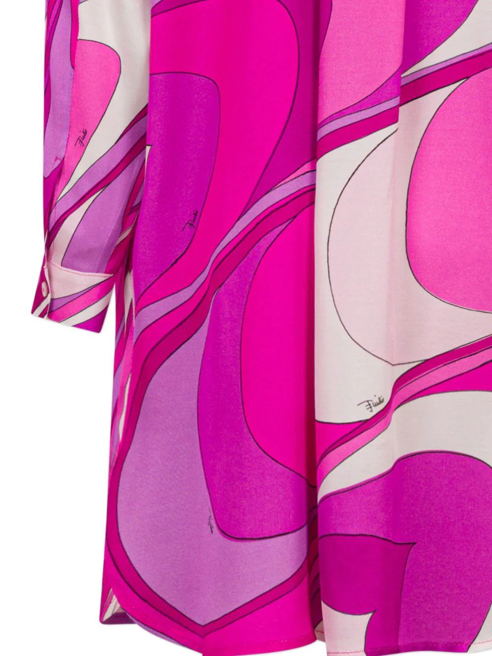 Abito con stampa Pucci Junior, viola/bianco, leggerissima, colletto classico, maniche lunghe, polsini con bottone, stampa fantasia astratta, tasca sul petto, abbottonatura sul davanti.