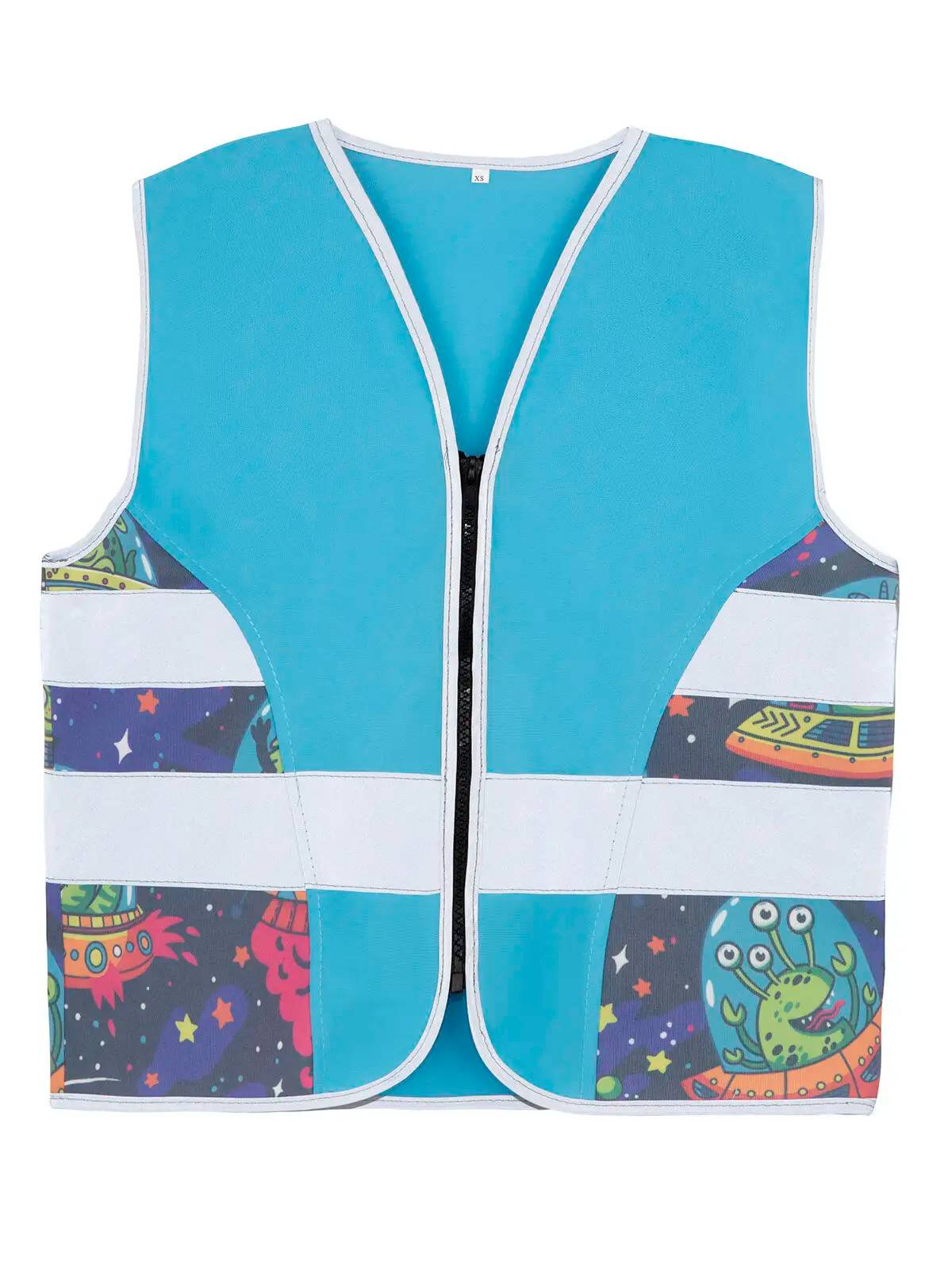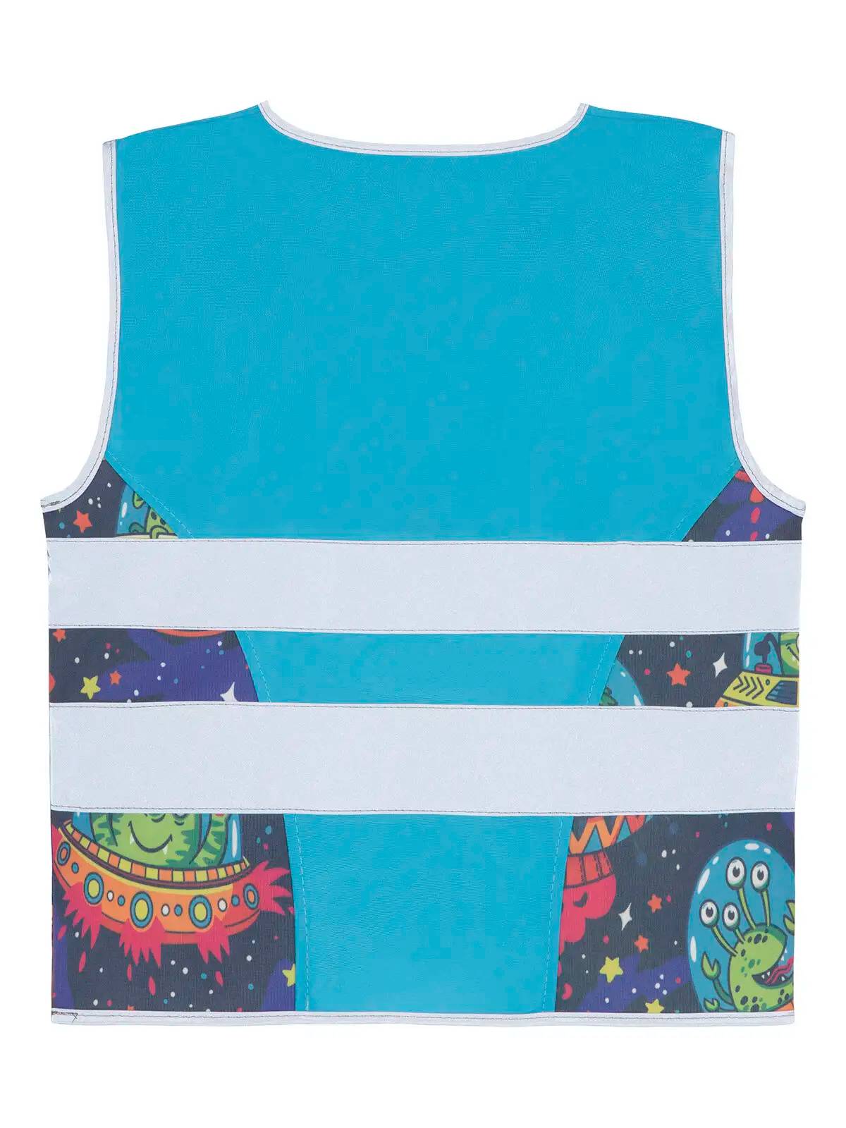 100% poliestere. Gilet ad alta visibilità per bambini con disegni galattici, alta visibilità grazie al tessuto leggero a fantasia con rivestimento riflettente e strisce riflettenti, chiusura con pratica cerniera. certificato secondo la norma EN 17353