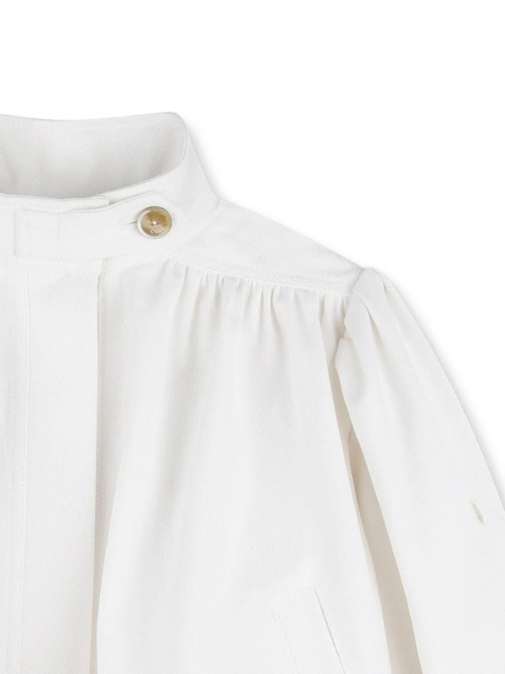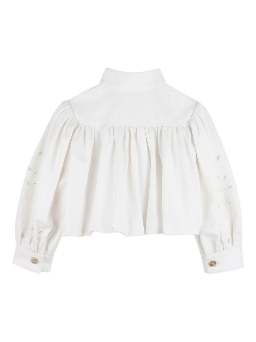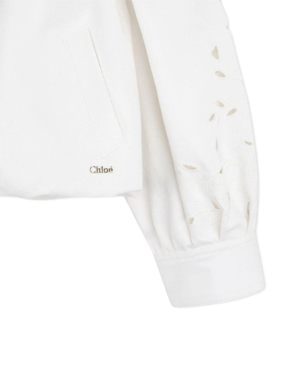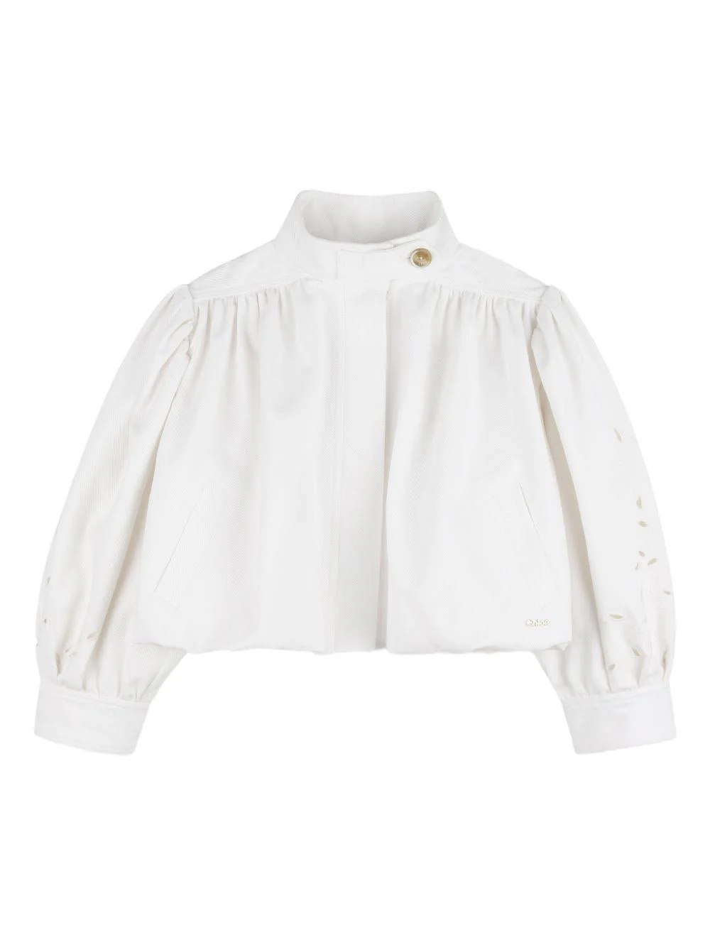 Giacca a fiori Chloé Kids, bianco, collo alto con bottone, maniche lunghe a palloncino, polsini con bottone, fiori ricamati con dettaglio cut out, placchettina con logo, due tasche sul davanti.