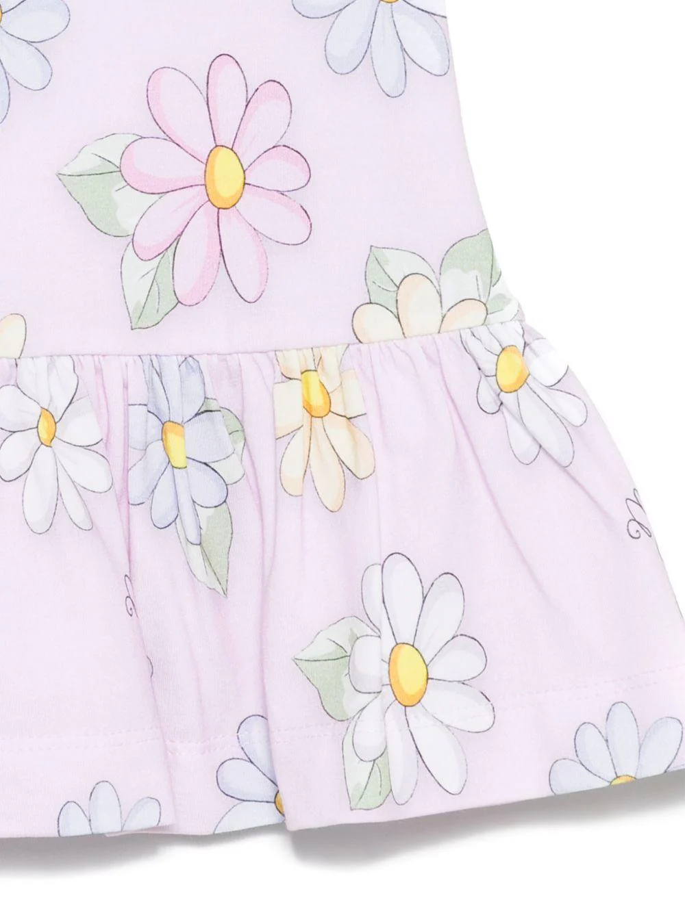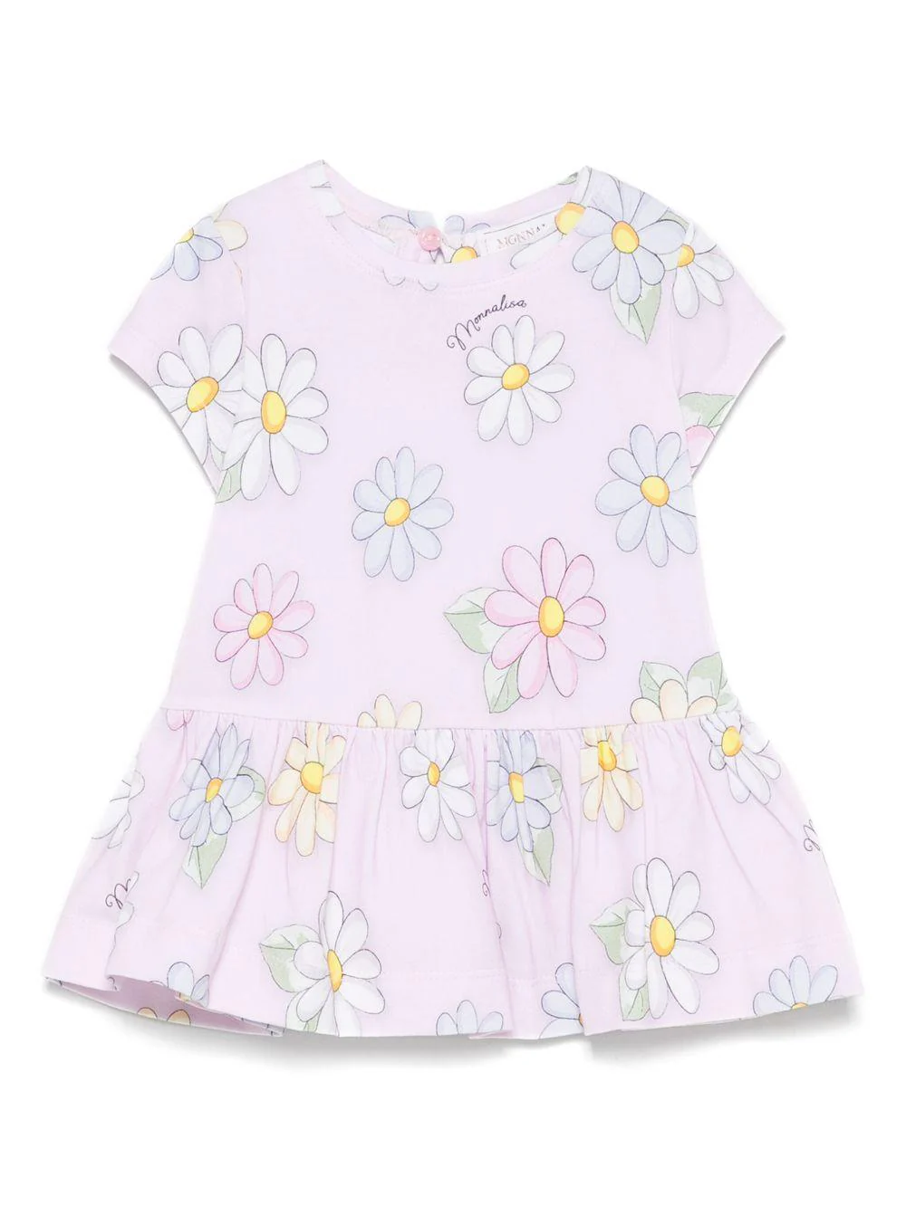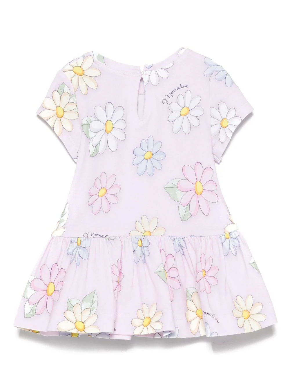 Abito a fiori Monnalisa, rosa, girocollo, maniche corte, stampa con margherite colorate, chiusura con bottone sul retro.